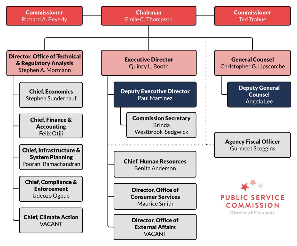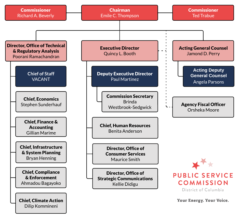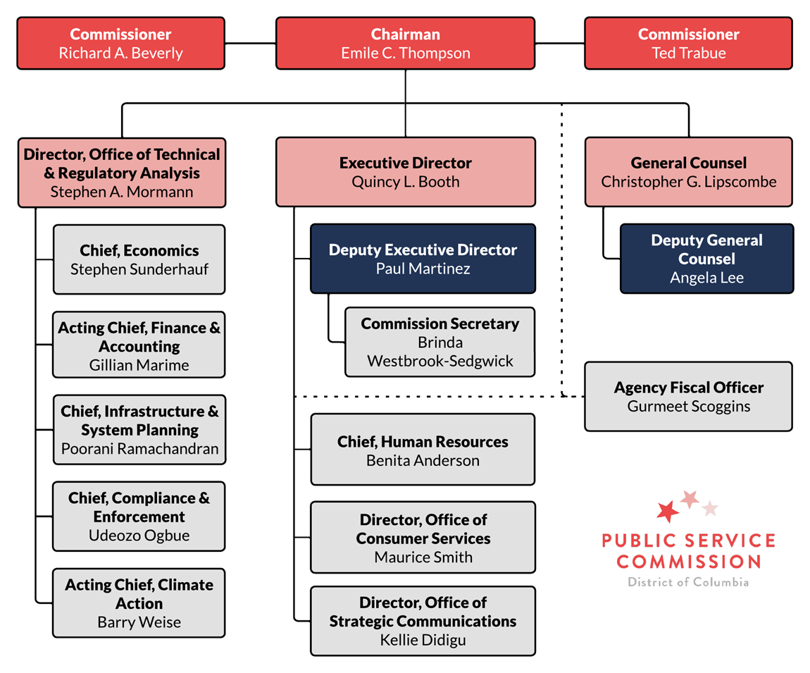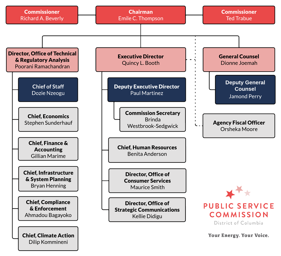 The Office of the Executive Director (OED) oversees the administrative offices of the Commission. The Executive Director is the performance officer for the Commission, responsible for developing and assuring completion of all strategic planning initiatives as well as overseeing the agency’s budget and financial management. The Deputy Executive Director, Chief of Human Resources, the Director of Strategic Communications, and the Director of Consumer Services report to the Executive Director.